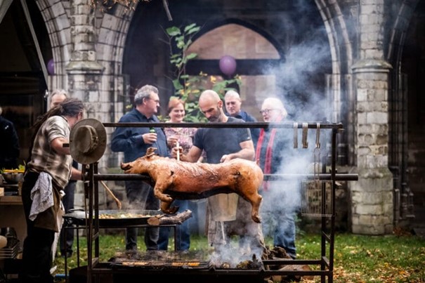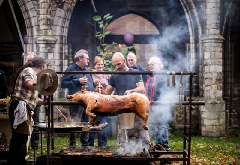Ovelias (lam aan 't spit') en gepekeld nekgebraad van het varken over smeulend perenhout