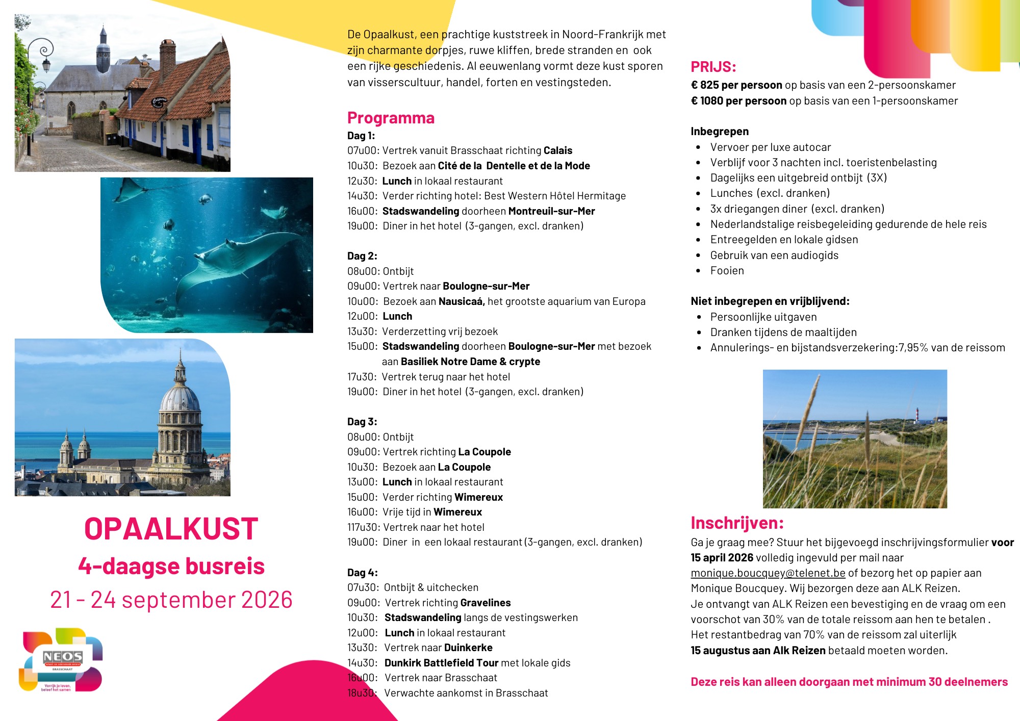 Na een geslaagde 4-daagse reis naar Elzas kijken we uit naar onze volgende reis met als bestemming 'De Opaalkust'. Ga je graag mee, neem contact met Monique Boucquey - 0479 37 04 91