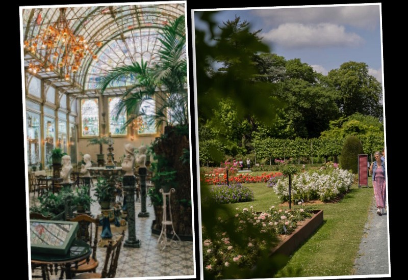 We wandelen tussen hoge bomen en open grasvelden om terecht te komen in de rozentuin, die in deze tijd van het jaar op z'n mooist is.