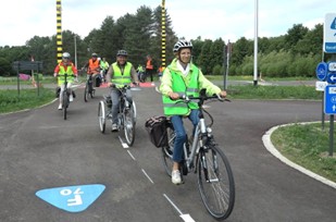 Omdat we het veilig willen houden, dragen we allemaal een fietshelm en een fluohesje.