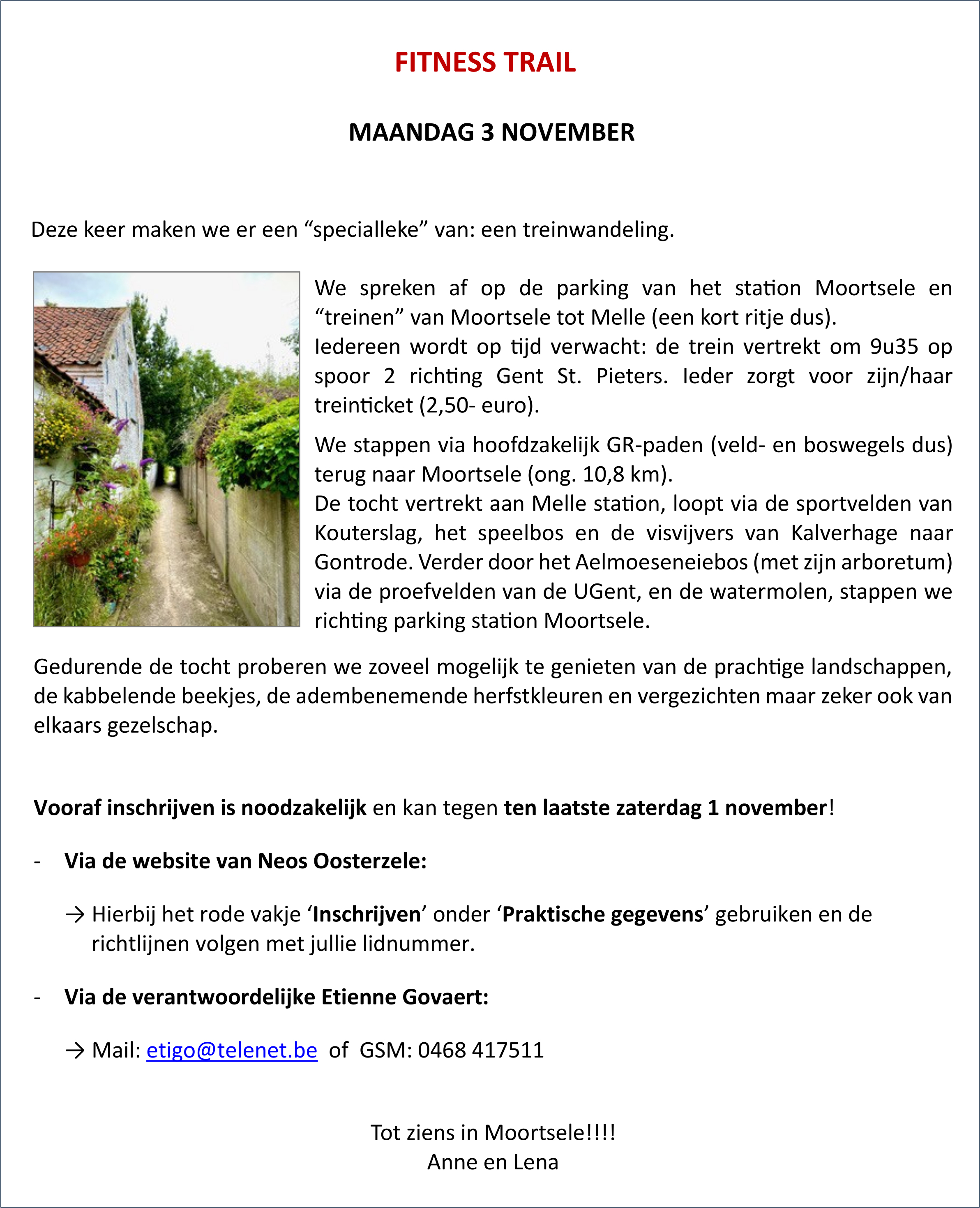 Verzamelen op parking station Moortsele / Vertrek trein 9.35 uur op spoor 2 richting Gent St. Pieters / Ieder zorgt voor eigen treinticket!