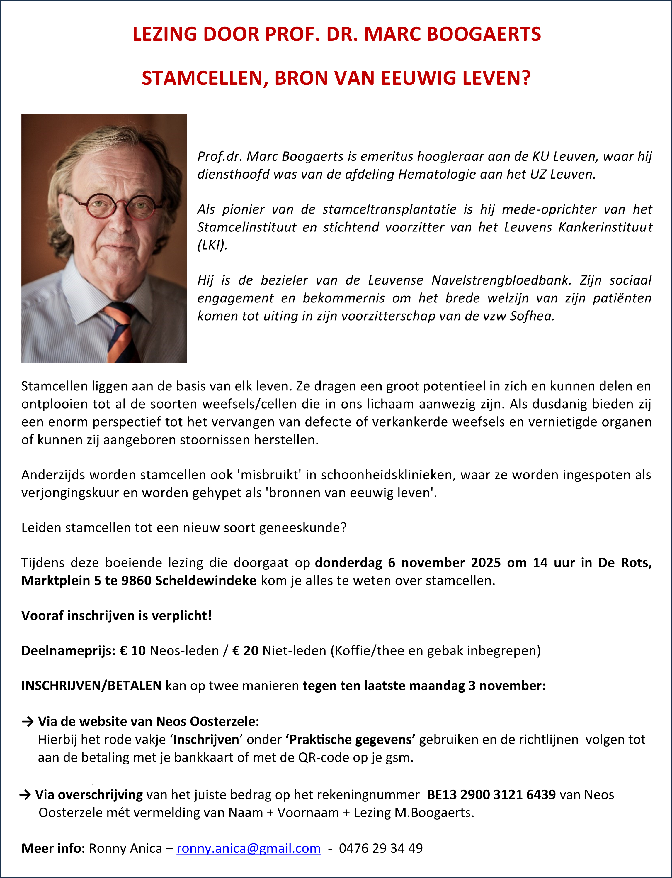 Lezing door Prof. dr. Marc Boogaerts: Stamcellen, bron van eeuwig leven?