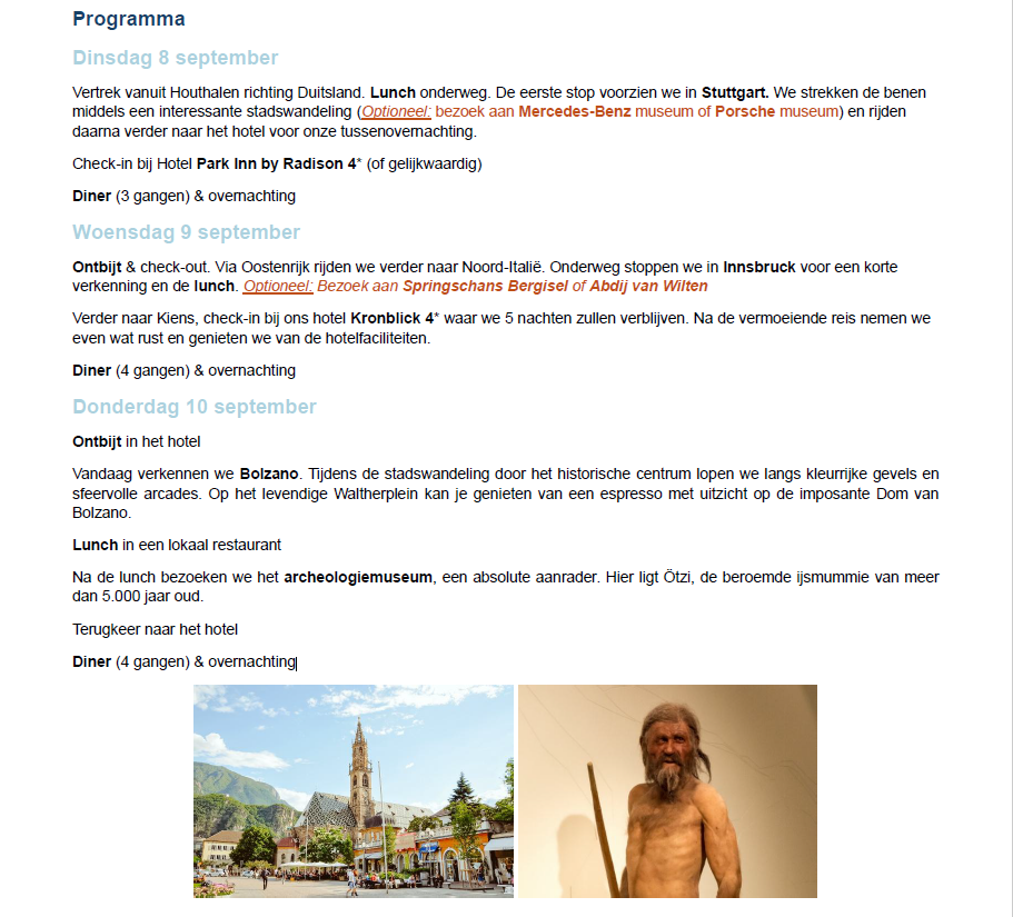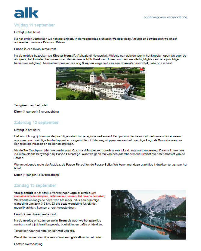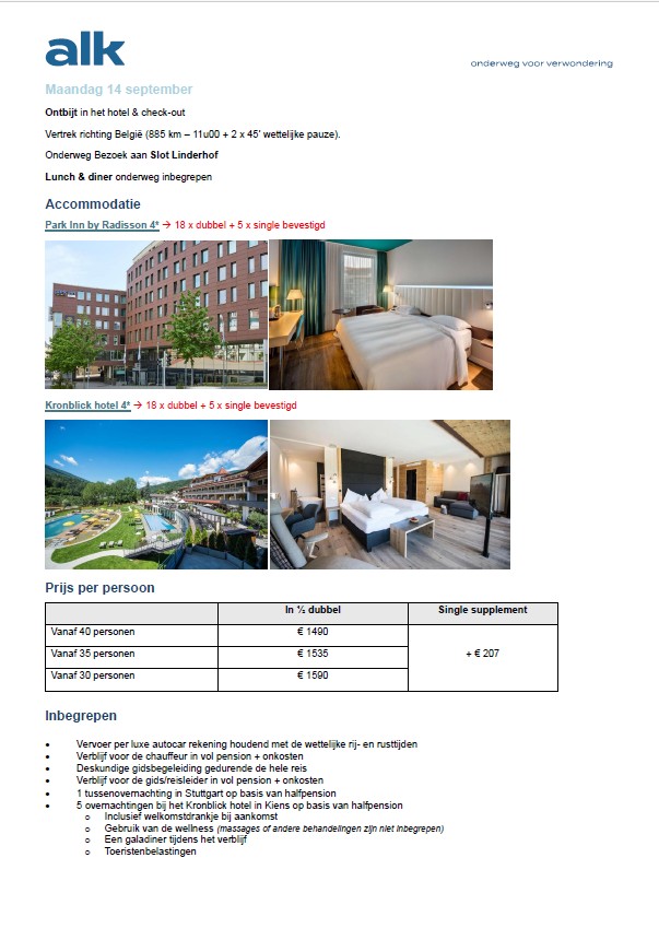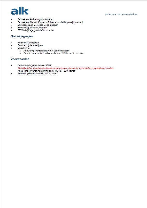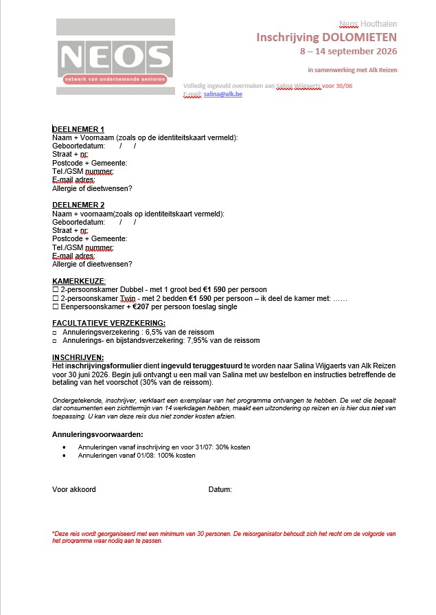 Nadat de inschrijvingen afgesloten zijn op 26 mei 2026, worden dan de vastleggingen gedaan door ALK reizen als we aan 30 deelnemers komen, komen we daar niet aan dan wordt de reis afgelast. Nadat deze beslissing is genomen worden de bestelbons opgemaakt door Salina van ALK reizen en aan iedereen bezorgt, op deze bestelbon staat dan het voorschot dat dan dadelijk dient betaald te worden en de uiteindelijke betalingsdatum voor het saldo van de factuur.