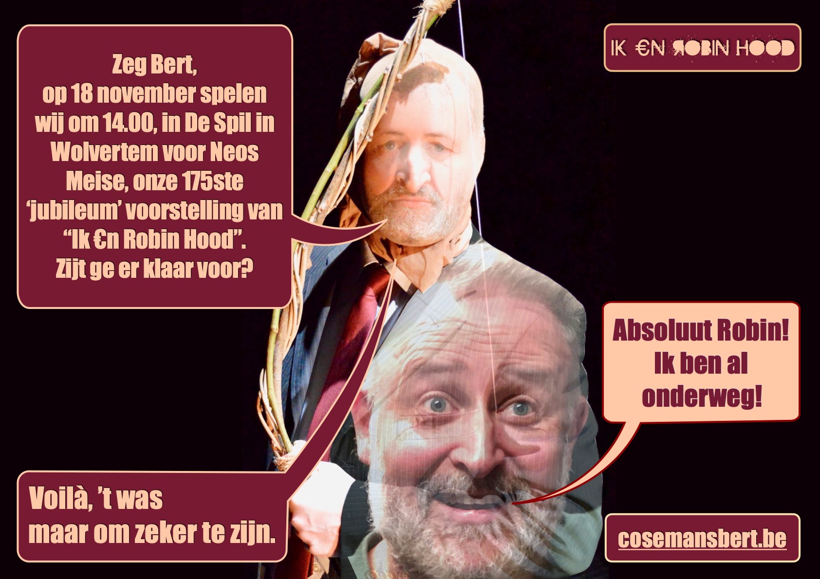 De vader van Bert was baas van een deurenfabriek en geloofde in het individu en ondernemingszin. Zijn grootmoeder aan vaderszijde, Natalie, geloofde in de gemeenschap en lag vaak overhoop met haar zoon. Ze liggen nu naast elkaar op het kerkhof. Zo groeide Bert op, constant heen en weer geslingerd, tussen die twee nogal verschillende opinies én zijn fascinatie voor Robin Hood, die stal van de rijken en gaf aan de armen. Dus besloot hij op zijn 10de de plaatselijke Kredietbank te overvallen. Veertig jaar later stelt hij zich nog steeds vragen over de ongelijkheden in onze samenleving. Wanneer we vandaag horen dat er ongeveer 150 miljoen kinderen op straat leven zijn we heel even heel verontwaardigd, om daarna terug over te gaan tot de orde van de dag. We gaan gewoon verder met ons leven zonder het kapitalisme in vraag te stellen en zo eigenlijk alle macht aan de grootbanken en de multinationals te geven. In de voorstelling vertelt Bert over hoe hij zijn naam op een theateraffiche ziet staan, iets waar hij altijd al van gedroomd heeft, en toch ontevreden is. Ontevreden zoals iemand die 25.000€ in de maand verdient en zich toch nog arm voelt in vergelijking met de superrijken. Dus besluit Bert een kunsthappening te organiseren. Hij gaat voor een bank staan met een pancarte met daarop een provocerende vraag… Bert werd gearresteerd… wegens het verstoren van de openbare orde. Maar gebeurde dit allemaal wel echt? Het maakt niet uit of het echt gebeurde of niet, of de 10-jarige Bert een Robin Hood in ’t klein probeerde te zijn of niet. De Robin Hood legende is tenslotte zelf een verzinsel… of niet? Dit is een vertelling die plagend speelt met feiten en fictie en ons uitdaagt om ons leven terug in eigen handen te nemen.