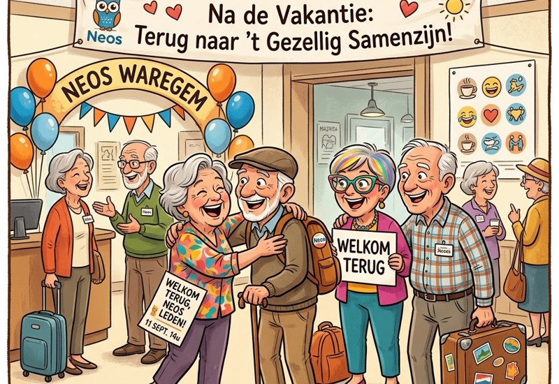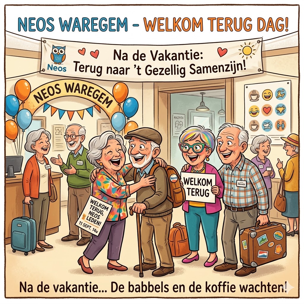 Na een deugd doende vakantie hunkert iedereen terug om elkaar terug te zien in een "leuke kwebbelnamiddag" en ons klaar te stomen voor een druk Neos jaareinde. Uiteraard zorgen wij nog voor een humoristisch intermezzo.