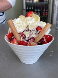 Coupe Hannekensnest (= vanille - ijs , aardbei - ijs op een bedje van zoetigheid overgoten met een rode vruchten coulis afgewerkt met verse aardbeien en slagroom)