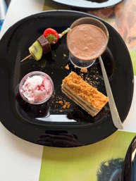 Verwenbord Hannekensnest: (= potje choco mousse, speculoos bavarois, bol ijs en fruitspies)