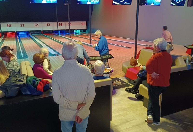 soms lukt het dat de bal jouw baan perfect volgt, soms mis je al eens alle pins, aanmoedigingen om mekaar te steunen vergroten het spelplezier.